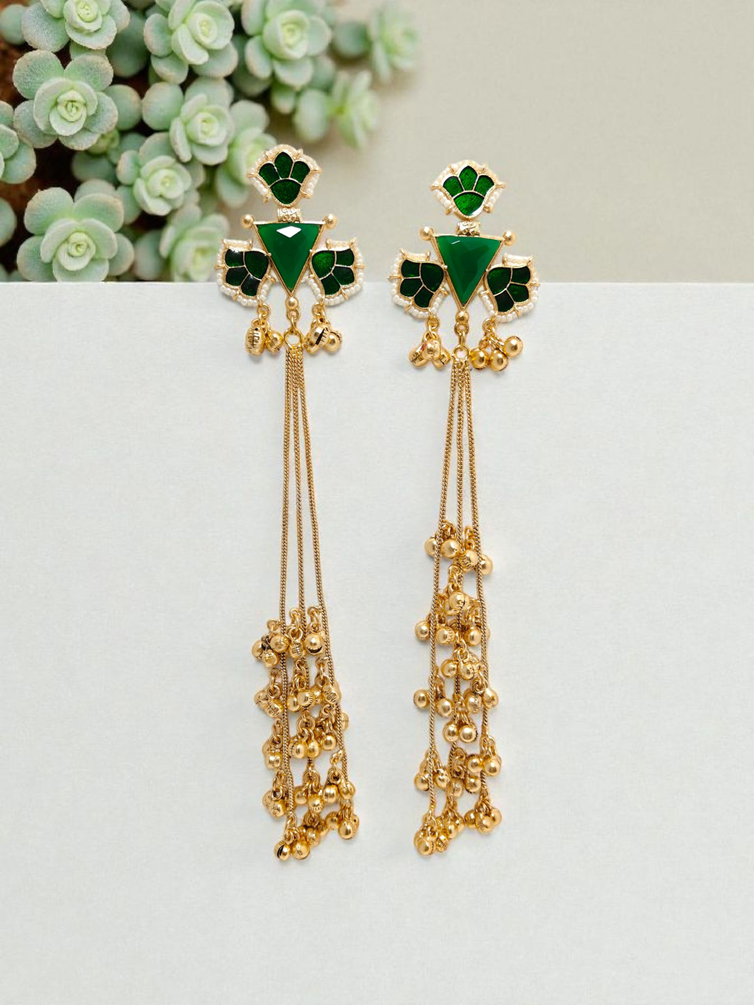 Kashmiri Earrings feature gold toned metal work with green stone accents and pearl details, adorned with long, delicate chains and golden beads.