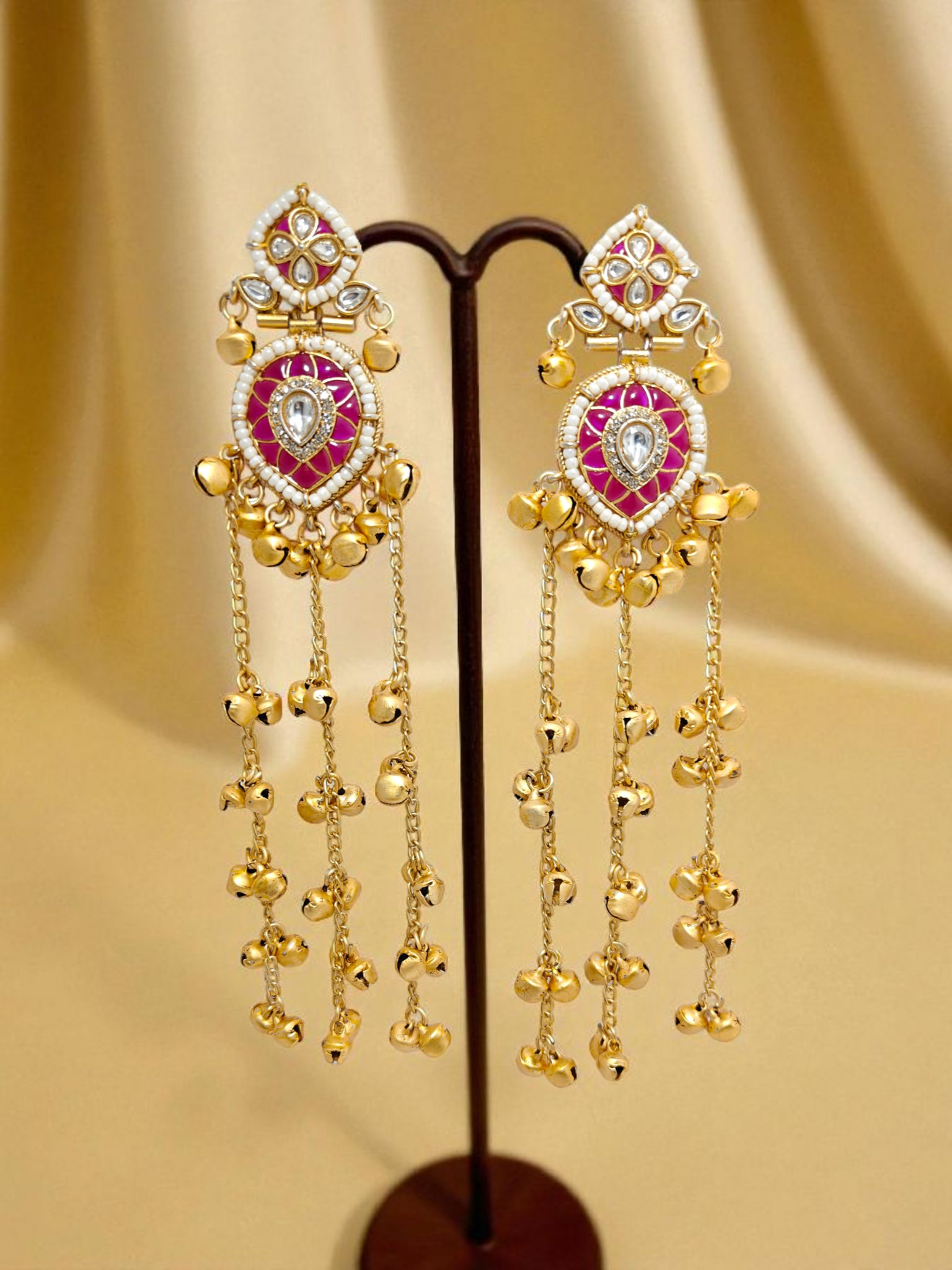 Kashmiri Earrings feature intricate gold designs with pink and white accents, Kundan stones and delicate golden chains adorned with small bells.