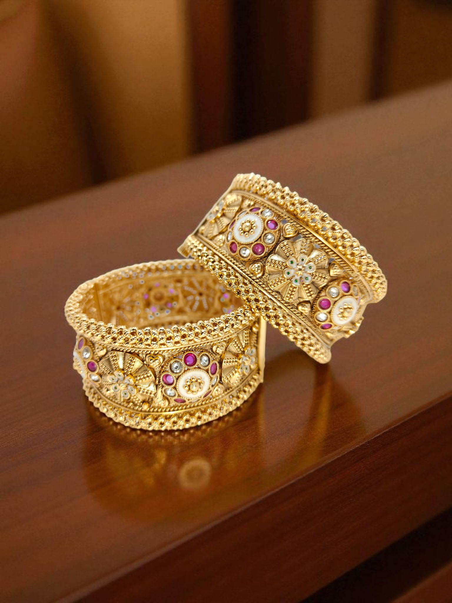 This pair of gold-plated polki bangles with intricate designs and gemstone embellishments.The bangles boast a rich, ornate design, featuring floral patterns and gemstones in shades of pink and white, adding to their luxurious appearance.